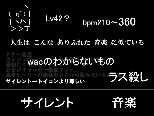 で、quasar(A)。当たり外れも少なく、できる人にとってはただの稼ぎどころなんですが、できない人にとってはスコアどころの騒ぎじゃないです。おそらく思惑としては、前大会以上にチーム内でのやりとりが重要視される本オリコバトルにおいて、当然想定すべき事態を想定できるか否かの試金石としての“穴クエ“なんでしょうけど、個人的にはここまで実力がスコアに直結するような曲は控えるべきだったんじゃないかとも思うんですよね。同じ☆11内でもD.C.Fish(A)とか、Love is Eternity(A)とか、華蝶風雪(A)とか、そこまで譜面認識力が問われない曲にすべきだったんではないかと。うーん我ながら非生産的ですね。ポジティブに行きましょう、穴クエなんてワシャワシャしてれば大丈夫、発狂地帯以外を頑張ればクリアできていなくてもそれなりのスコアは出ます!たぶん。