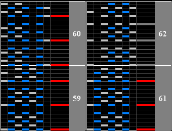 これ以降はほとんど回復が望めないので、いかにゲージ減少を抑えて螺旋地帯に突入できるかが鍵となります。62小節はどうしても皿と1鍵の両立が難しいので、皿を捨てて右手で4567。66小節も右手側がキツイので皿を捨てます。