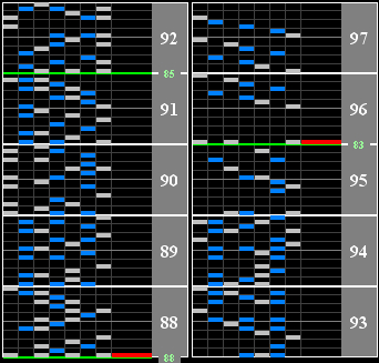 卑弥呼さん突破に際していきなり大きな障害となるのがソフラン前の縦連地帯(下図)。速度もさることながらリズムが非常に変則的で、些細なズレが命取りとなります。まず